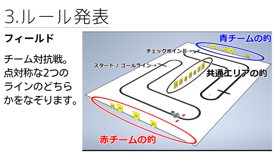 コースを 1周 すると 25点、的を倒すと 大きさに応じて10点から20点 が入ります。 3分間 でより多くの点数を獲得したチームの勝利です。