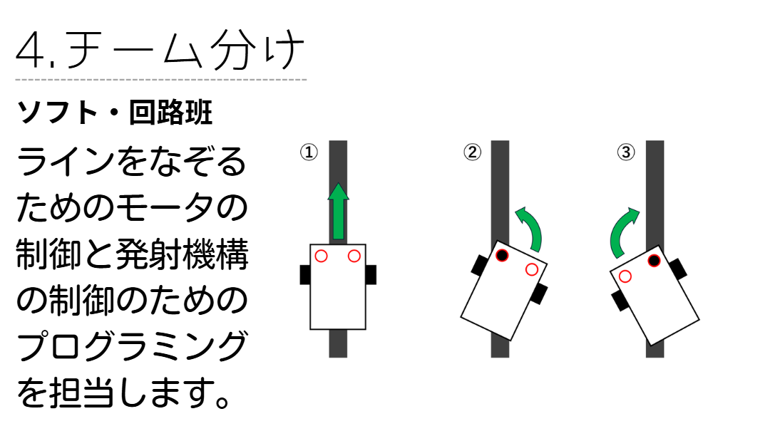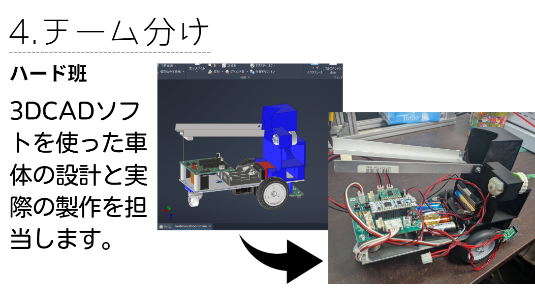 説明会では新入生ロボコンのルールを発表したのち、ハードウェアを担当したい人とソフトウェアを担当したい人に分かれてチーム決めを行いました。 バランスよく分かれることができ、15チームが結成されました。